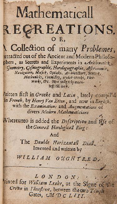 [Mathematics] Oughtred, William. Mathematicall Recreations. Or, A Collection of many Problemes, Extracted out of the Ancient and Modern Philosophers… Lately compiled in French by Henry Van Etten (i.e. John Leurechon), and now in English. London: for William Leake, 1653. With in-text engravings and head-pieces. Includes information on and illustrations of fireworks. Full calf. Gilt-lettered spine label. 12mo. Lacking folding engraved title. Bookplates tipped in front and rear pastedown and f.f.e.p., engraved ex-libris to first blank leaf, endpapers renewed.