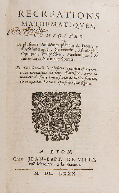 [Mathematics] Leurechon, Jean. Recreations mathematiques, composees. Lyon: Jean-Baptiste de Ville, 1680. Two parts bound in one, paginated separately. Numerous in-text woodcut diagrams throughout. Contemporary calf. 8vo. Rubbing to boards with loss at spine ends and corners and a few scratches, manuscript ex-libris to front pastedown and title page. Otherwise a very good copy, internally clean.