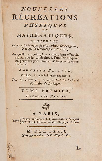 [Mathematics] Guyot, Edme-Gilles. Nouvelles Recreations Physiques et Mathematiques. Paris: Gueffier, 1772-75. Four volumes. Profusion of engraved plates, most colored, some folding. Modern quarter leather. 8vo. Fourth volume soiled, else generally good.