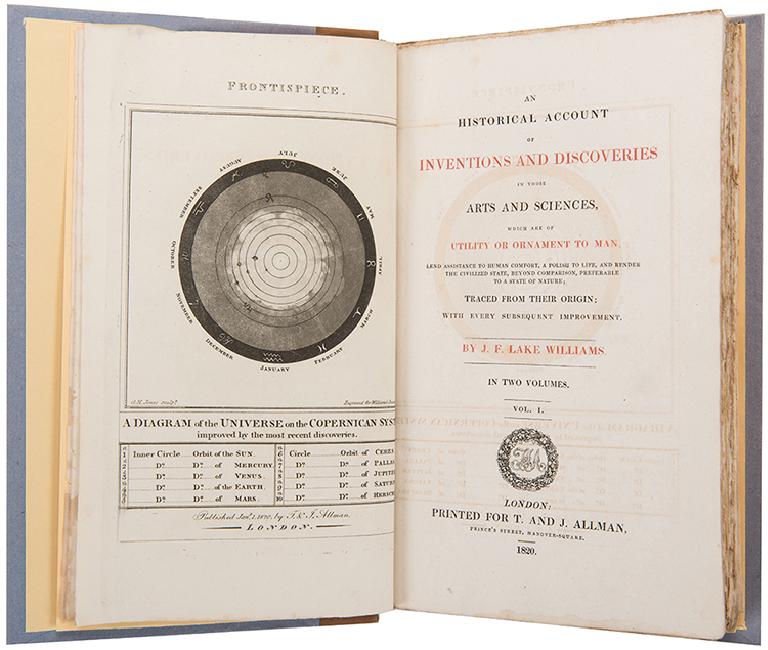 [Invention] Williams, J. F. Lake. An Historical Account of Inventions and Discoveries in those Arts and Sciences, Which Are of Utility or Ornament to Man. London: Printed for T. and J. Allman, 1820. Two volumes. Second edition. Advertisements to vol. 1. Engraved frontispiece to vol. 1. Rebound in quarter gilt-lettered calf. Renewed endpapers. 4to. Fine.