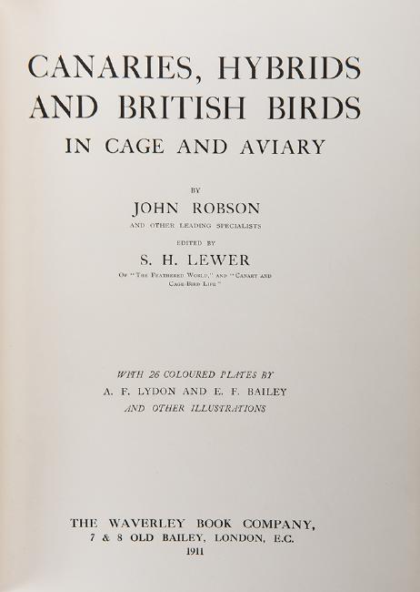 Robson, John. Canaries, Hybrids and British Birds in Cage and Aviary. London: The Waverly Book Company, 1911. First edition. Illustrated with numerous color plates. 3/4 crimson morocco over orange linen. Gilt-lettered spine. T.e.g. 4to. Light shelfwear, but internally clean.