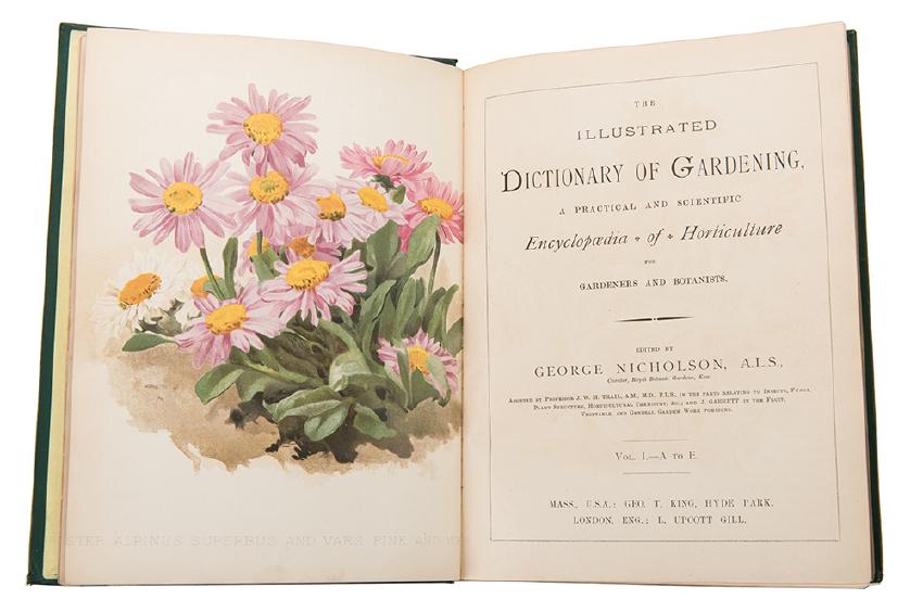 Nicholson, George, ed. The Illustrated Dictionary of Gardening. A Practical and Scientific Encylopaedia of Horticulture for Gardeners and Botanists. MA and London, ca. 1890. Four volumes, including the supplement. 24 color lithograph botanical prints and numerous in-text black and white illustrations throughout. Publisher's decorative cloth stamped in gilt and black. A.e.g. 4to. Ex libri, manuscript and blindstamepd to the f.f.e.p. and pastedown. Boards worn with wear to the spine ends.