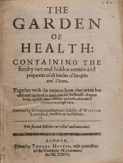 Langham, (William). The Garden of Health. London: Thomas Harper, 1633. Second edition. Engraved headpiece. Old calf. Rebacked retaining original gilt-stamped spine. 8vo. Renewed endpapers, boards restored, some wormholing.