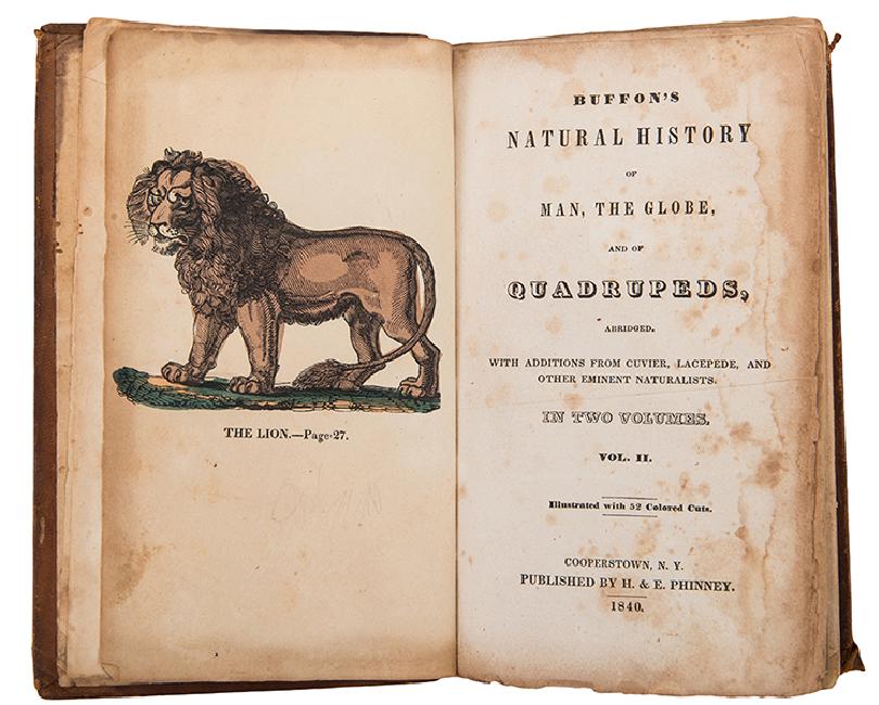 Buffon, George Louis Leclerc, Comte de. Buffon's Natural History of Man, The Globe, and of Quadrupeds, Abridged. Cooperstown, NY: H. & E. Phinney, 1840. Two volumes. Hand-colored plates throughout. Full contemporary calf. 8vo. Boards worn and hinges starting. Internally clean.