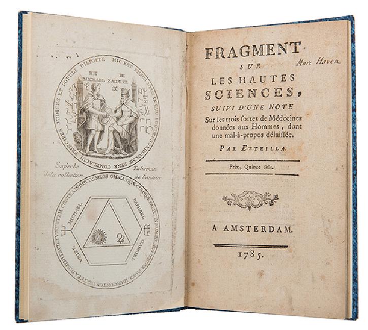 Alliette [Etteilla]. Fragment sur les hautes sciences. Amsterdam, 1785. First edition. Engraved frontispiece of a talisman. Rebound in modern blue decorative boards with gilt-lettered spine label. 12mo.