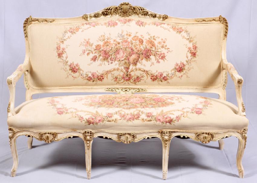 FRENCH LOUIS XV STYLE SETTEE & SIDE CHAIRS, 3 PCS. :French sofa and side chairs having tapestry upholstery with pink floral medallions on the seats and back cushions. Carved crests with acanthus leaf designs on the frames on all three pieces. Sofa measures: 42 1/2" H. x 60" W. x 27" D. Chairs measure: 38" H. x 21" W. x 21" D.