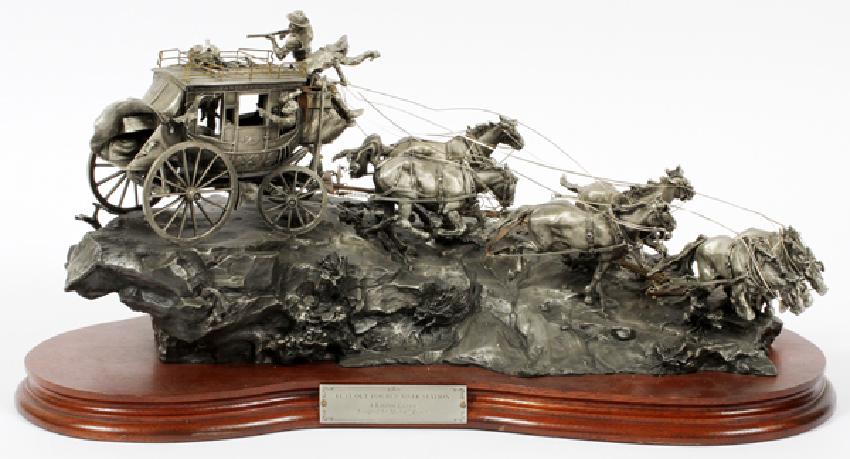 MICHAEL BOYETT, PEWTER SCULPTURE, H 8", W 17", "FLAT OUT FOR RED RIVER STATION":Chilmark. Limited edition, western theme. #758/2500. Signed. Wood base.