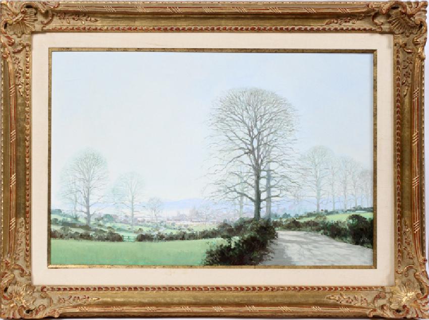 JOHN MILLER OIL ON CANVAS, H 24", W 36", "WINTER SHADOWS":Depicting a rural landscape with shadows in Winter. Signed and titled on verso. Middleton Gallery Baltimore, MD label on verso.