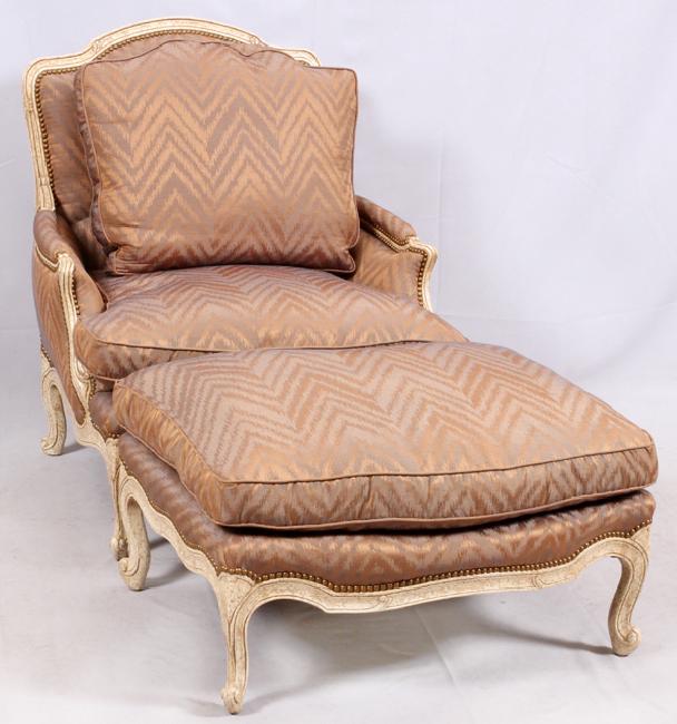 FRENCH, LOUIS XV STYLE, CHAIR & OTTOMAN:Upholstered arm chair with loose back and seat cushions, antiqued finish. Contoured frame and cabriolet legs, 38" H. x 30" W. x 36" D. Large upholstered ottoman also with antiqued finish contoured frame and cabriolet legs, 16" H. x 32" W. x 24" D. Both pieces having brass upholstery nail trim. Yale R. Burge Antiques Inc., New York, NY label underneath seat cushion.