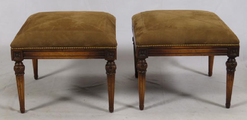 FRENCH, LOUIS XVI. CARVED WALNUT FOOTSTOOLS, 19TH C, H 22", W 24", L 24":Having a carved walnut frame, brown suede cushions, with brass upholstery nails, tapered and fluted legs.