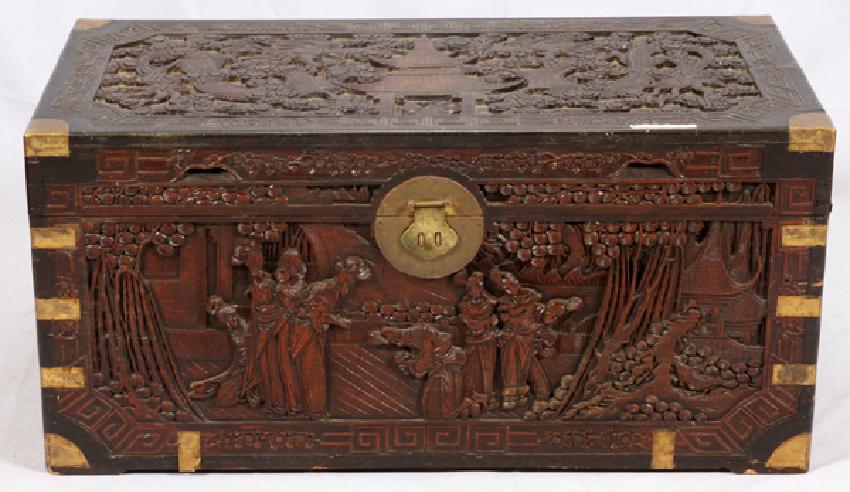 CHINESE, CARVED TEAKWOOD, BRASS CHEST, WROUGHT IRON HANDLES, 19TH C, H 20", W 44", D 21":Chinese carved teakwood chest with figures on all sides, cedar lined. Brass fittings and straps at the corners. Wrought iron hanging wire handles.