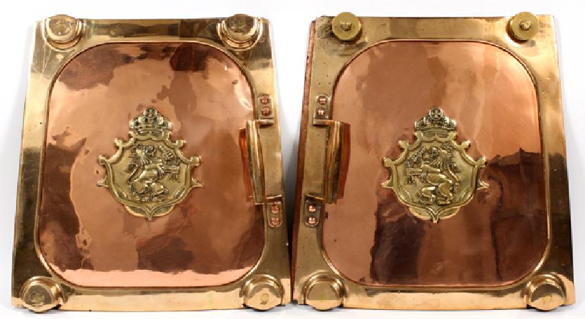 GROUP OF THREE STROH'S COPPER AND BRASS FLAMKESSEL PIECES, H 18"-19" W 18"-18":Two flamkessel doors are of copper and brass, with a brass Stroh family crest in the center and brass framing at the edges with . 18 1/2" H. x 19" W and one copper plaque reading "Flamkessel The Stroh Brewing Co.", also with a brass Stroh crest in red. Plaque: 6 1/2" in height, 14" in length. Flammkessel translates to flame boiler. Also includes a signed 1975 color photo of Chairman John Stroh, President Peter Stroh, Eric Stroh, Gari Stroh Jr. and John Stroh Jr. Framed under glass, 8" H x 10" W.