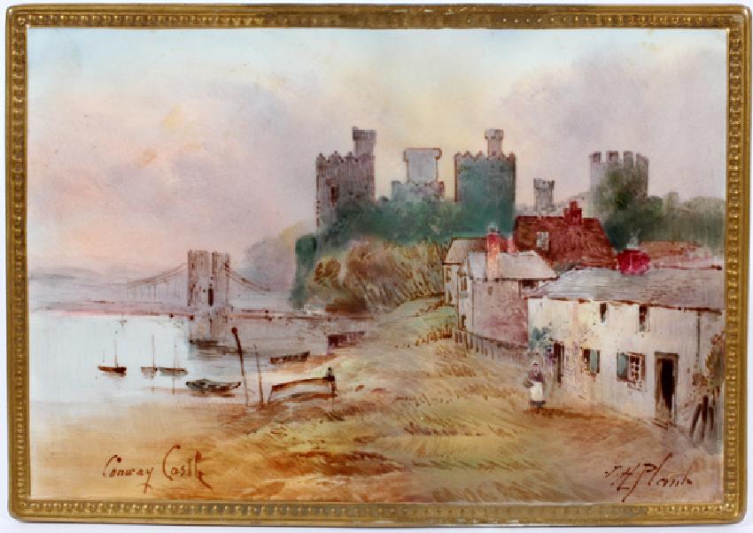 ROYAL DOULTON PAINTED PORCELAIN SCENIC PLAQUE H 6 1/2" W 9 1/8":Titled "Conway Castle" lower left corner. Signed "J.H. Plank" to lower right corner. Depicting Conway Castle in background with village scene to foreground. Gilt beaded border. Fitted to porcelain stand, marked "Royal Doulton" to underside.