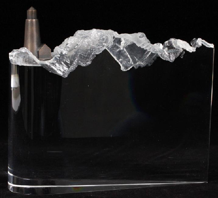 STEUBEN CRYSTAL AND BRONZE LIGHTHOUSE BY JAMES HOUSTON H 7 1/4" L 8 3/4":Signed. In original red leather fitted box.