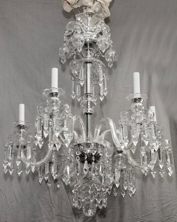 CRYSTAL SIX LIGHT CHANDELIER, C. 1940, H 32", DIA 38":Cut crystal arms. Read more…