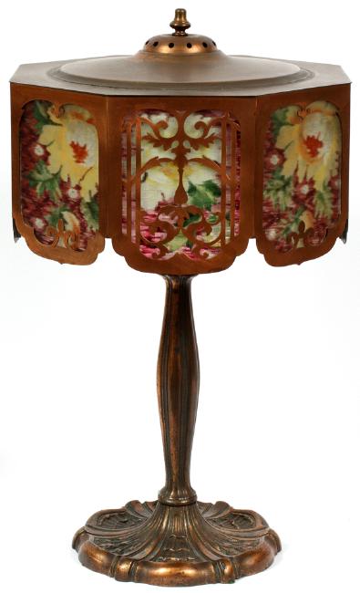 PAIRPOINT REVERSE PAINTED TABLE LAMP, LATE 19TH C. , H 21 3/4", DIA 11 3/4":Having an octagonal shade with eight hand reverse-painted ribbed glass panels decorated with floral scenes and openwork brass overmounts, raised on a dual-socket flared standard above an Art Nouveau stylized base. Marked to underside. Shade is apparently unmarked.