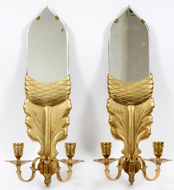 CHAPMAN, BRASS AND MIRRORED GLASS, 2-CANDLE LIGHT WALL SCONCES, 1972, PAIR, H 19", W 8":Pair of natural candle, brass and mirrored glass wall sconces with leaf designs. Marked Chapman on verso.