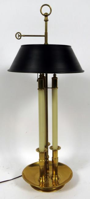 BRASS AND TOLE THREE-LIGHT CANDLE LAMP, H 30", DIA 15":French style three-light bouillotte lamp with scroll arms, candle forms and an adjustable tole shade. Read more…