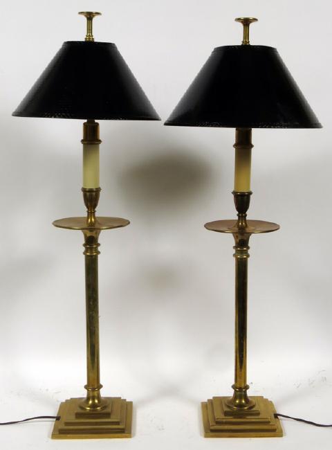CHAPMAN BRASS LAMPS, ELECTRIFIED, 19TH C, PAIR, H 36":Pair of Chapman brass lamps. Depicting tall candle sticks with round wax collectors below candle motif fixture. Black shades, brass shaft with tiered brass square bases. Electrified. C1900.