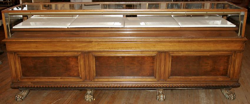 JEWELRY SHOWCASE, WALNUT CIRCA 1940 H 43" L 78":Height with feet is 43". Without feet 37". Lowest of all cases with pull out drawers. Glass top and sides with green felt-lined drawers for display at the top, above locking drawers for storage below; with four bronze cast lion paw feet. With keys. Measures overall H.34 1/2" x 6' 6" x 24".