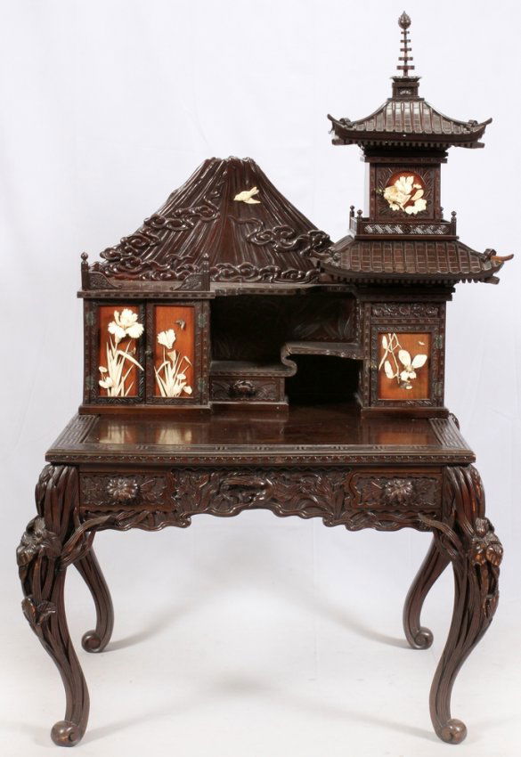 JAPANESE CARVED TEAKWOOD DESK C. 1900 H 74" W 47" D 33":Hand-carved teakwood desk with flat writing surface, the upper section in the form of Mt. Fuji alongside cabinet imitating a pagoda, applied carved ivory irises, raised on tall cabriole style legs. The table and the top are two separate pieces.