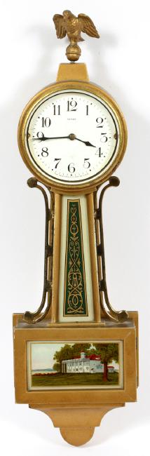 NEW HAVEN "MOUNT VERNON" REVERSE PAINTED MINIATURE BANJO CLOCK, EARLY 20TH C. , H 15 3/4":A gold painted case with an eagle finial to the top, over a 3 5/8" painted Arabic hour dial that is signed "The New Haven Clock Co., USA" and "12 Day". The case having pierced brass side attachments encasing two reverse painted glass panels depicting George Washington and Mt. Vernon respectively.