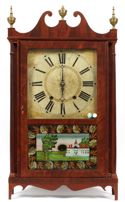 HOPKINS & ALFRED MAHOGANY PILLAR AND SCROLL CLOCK, H 29", W 16":A mahogany pillar and scroll clock, holding a square painted wood dial having Roman hour numerals with gilt spandrels, two key wind, above a reverse-painted scene on the window below. Marked at the interior back 'Hopkins & Alfred, Harwinton, Conn.' Two weights. Measures overall H.29 1/2" x 16 3/4" x 4 1/2" approximately.