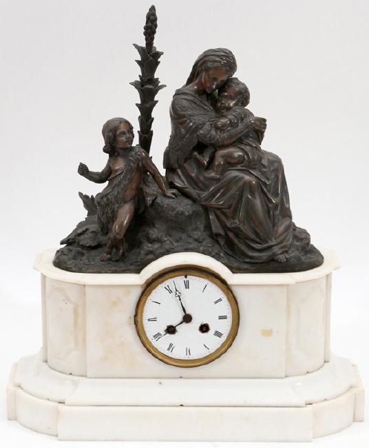 FRENCH BRONZE AND MARBLE MANTEL CLOCK, 19TH CENTURY, H 18", W 17", D 6":A bronze sculpture depicting Madonna with child and St. John over an architectural white marble close case; an enameled dial with a two key wind below. From The George and Penny Simon Collection, Grosse Pointe Farms, Michigan.