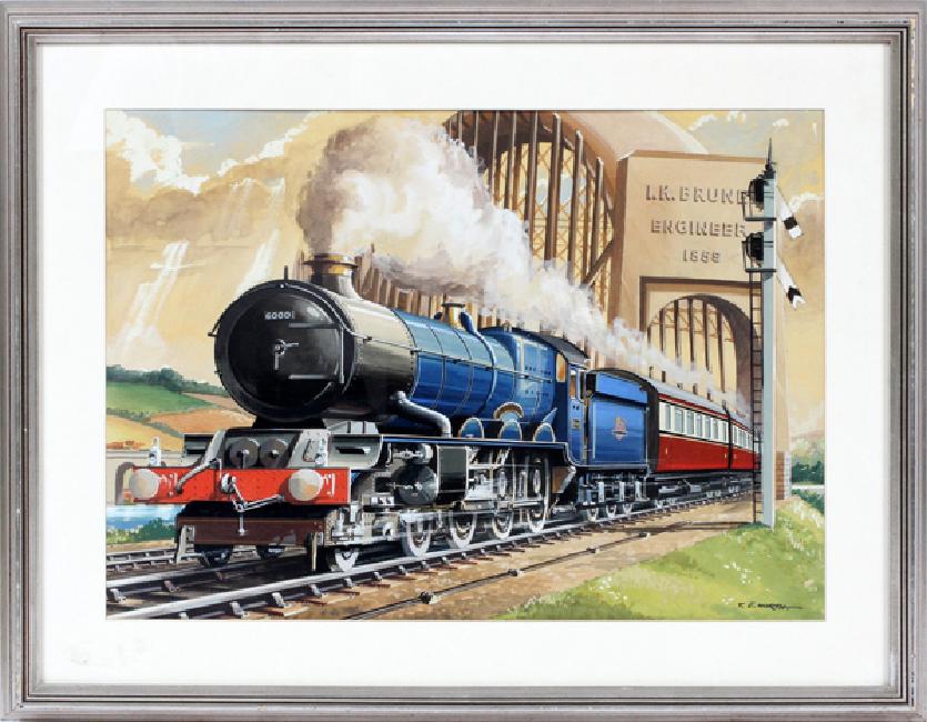 T. E. NORTH (AMERICAN, 20TH C.) GOUACHE ON PAPER H 13 1/2" L 19 1/4":Depicting the train "King George IV" over Saltash bridge. Signed lower right. Framed.