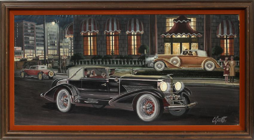 CASEY GEERTS (20TH C. ), OIL ON BOARD, 1978, H 24", L 48", URBAN SCENE WITH CAR:Signed and dated 1978 lower right. Depicting a classic automobile with figures throughout. A typical early 20th century nighttime scene.