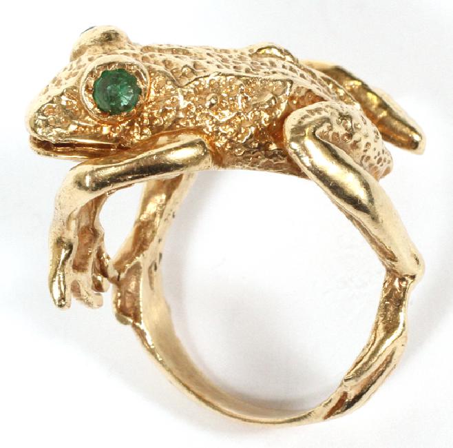 14KT YELLOW GOLD FROG RING, 15 GRAMS, EMERALD EYES:Marked 14kt.