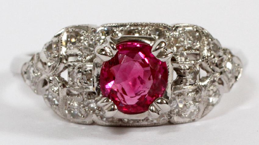 . 94 CT BURMA RUBY WITH DIAMONDS RING GIA CERTIFICATE:Platinum setting. Art Deco style.