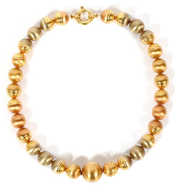 ITALIAN 18KT GOLD BEAD NECKLACE, 70 GRAMS L 17":18KT yellow, white and rose gold necklace, having 29 beads. Marked "750".beads are 13 1/2 to 19 mm. 70 grams.