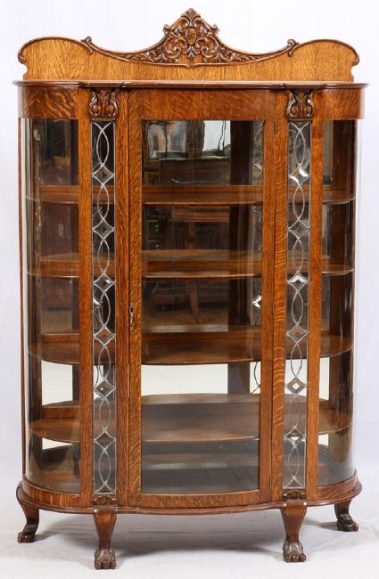 GOLDEN OAK CHINA CABINET; Serpentine glass door with carved with mirrored bak, lions" heads and claw feet, ca. 1900; 68 1/2" x 52" x 18" Read more…