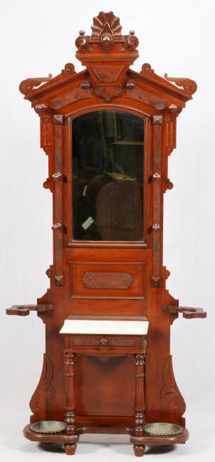 EASTLAKE CARVED WALNUT & BURL WALNUT HALL TREE WITH MARBLE TOP, LATE 19TH CENTURY:Gingerbread style crest, cast metal coat hooks, white inset marble top, two Read more…