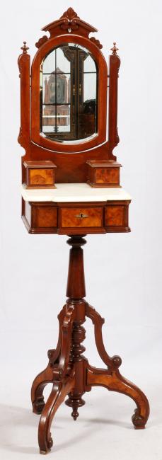 WALNUT SWIVEL SHAVING STAND, CIRCA 1850, H 72", W 17", D 18":Having a beveled mirror and a white marble top. The stands height can be adjusted and the stand swivels.