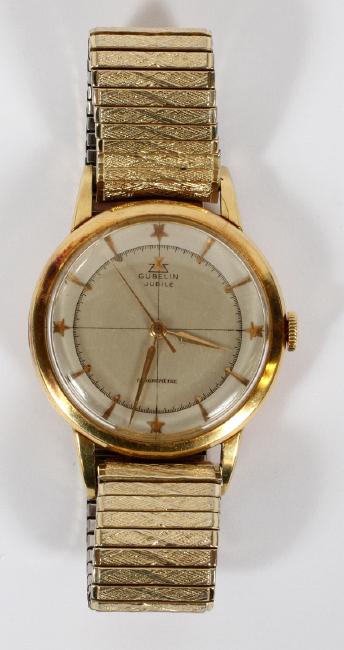 GUBELIN 18KT GOLD WRIST WATCH, DIA 1 1/2":A Gubelin 'Jubile' gentleman's wrist watch; an 18kt gold case numbered 154695. Star form numerals, engraved 'G.C. Averdson', with a Speidel band. A 19 jewel adjusted movement. The strap measures L.3 1/4" approximately.