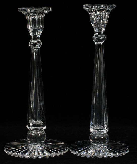 LIBBEY CRYSTAL SINGLE LIGHT CANDLESTICKS, C. 1920, PAIR, H 12":A pair of single light candlesticks of hexagonal form with flared bases; each marked at one side of the candleholder with acid etch mark. Similar pair featured in 1920 reprint of Libbey catalog seen in "Libbey Glass, Pictorial History and Collector's Guide" by Carl U. Fauster", p.301.