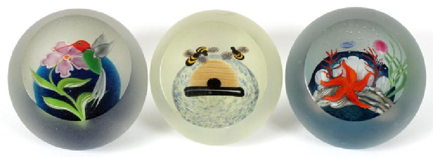 STEVEN CORREIA ART GLASS PAPERWEIGHTS, 3, DIA 2 3/4":Comprising: (1) frosted window paperweight depicting a hummingbird and flower, with acid etched signature, date of 1985, and numbered 113/200 to bottom; (1) frosted window paperweight depicting a beehive and bees, with acid etched signature, date of 1984, and numbered 47/100 to bottom; and (1) frosted window paperweight depicting a marine life scene, with acid etched signature, date of 1984, and numbered 49/200 to bottom. All paperweights having a diameter of 2 3/4".