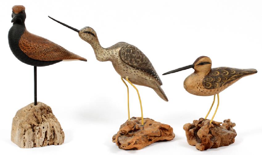 CARVED WOOD BIRD SCULPTURES, 3 PIECES, H 8 1/2"-13 1/4":Including 1 unmarked long-billed painted bird, H. 8 1/2" x 11"; 1 carved wood and painted bird, H.13 1/4", signed 'Dan Williams, '89'; together with 1 other carved wood bird, H.12 1/2" x 14", signed 'Ed Green, 88' and titled at underside.