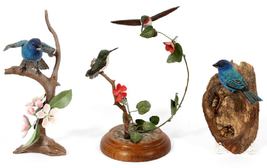 CARVED WOOD BIRD SCULPTURES, 3 PIECES, H 6 3/4"-9 3/4":Includes 1 blue carved bird on a wood perch, H. 6 3/4", signed by artist Kathy Boyle Hofmann, dated 12/86; 1 hummingbird group sculpture, H.9 3/4", signed 'K. Boyle' for Kathy Boyle Hofmann, dated 1/91; together with 1 indigo bunting on apple blossoms, H.9 1/2", signed by artists' Ed and Esther Burns, titled ' The Duck Nest', St Michaels, Maryland.