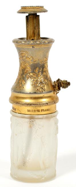 LALIQUE CRYSTAL ATOMIZER, CIRCA 1920, H 4 3/4":Signed. Lalique and "Made in France" in molded block letters. Missing pin which connects two parts.