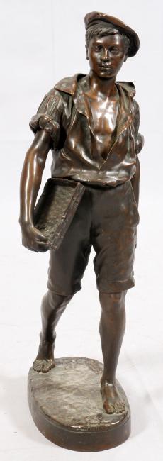 BRONZE, H 28", W 10", WALKING SAILOR:Depicts a young sailor carrying a small bucket and rectangular basket. Signed C. Congepied on base.
