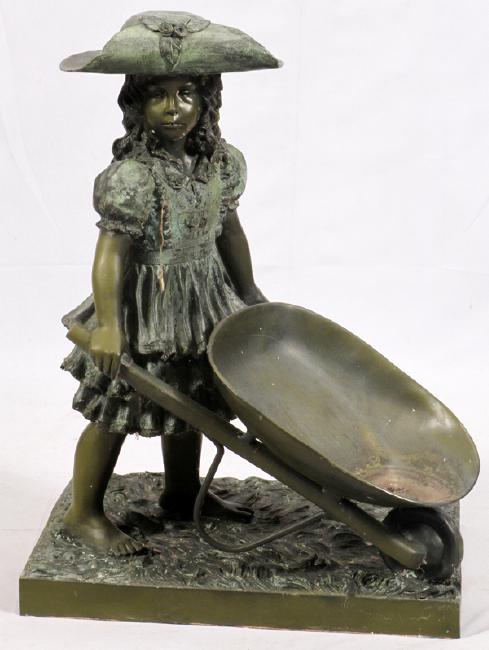 JIM DAVIDSON(AMER. B1962), BRONZE, H 33", W 19", L 28", GIRL WITH WHEEL BARREL:Depicts a barefoot young girl wearing a dress, wide brimmed hat and pushing a wheel barrow. Signed Jim Davidson on base. Dimensions at the base 28" x 19".