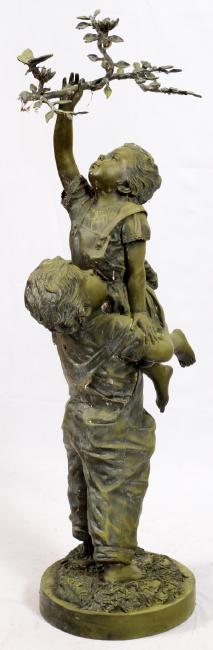 JIM DAVIDSON (AMER. B1962), BRONZE, H 60", W 20", BOY & GIRL:depicts a boy lifting a little girl in his arms as she is holding onto a branch. Signed Jim Davidson on the integral base.