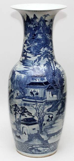 CHINESE PORCELAIN UNDERGLAZE BLUE VASE, H 36", DIA 14":Depicting a village scene overall, throughout the body. With medallions along the base edge. From the Estate of Daniel Clancy, Voltaire Place, Grosse Pointe Farms.