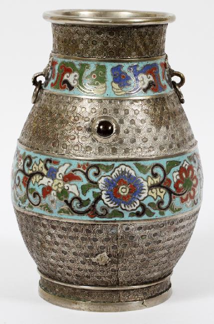CHINESE BRASS VASE, 19TH C. , H 9 1/2":Chinese brass vase, two champleve enamel bands.