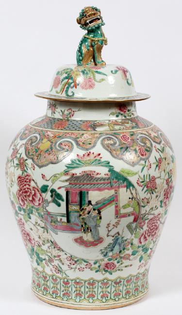 CHINESE PORCELAIN COVERED URN, C. 1890, H 27 1/2", DIA 16":Having a Foo lion finial with open mouth, a lid with gilt fired gold accents. Heavily decorated in floral designs with circular medallions depicting Mandarin scenes. From the Estate of Daniel Clancy, Voltaire Place, Grosse Pointe Farms.