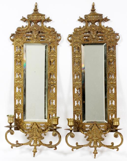 BRONZE TWO LIGHT SCONCES, PAIR, H 23", W 9":Each with a fish and urn form crest, having leafy borders surrounding a beveled mirror. Measures H.23" x 9" overall.