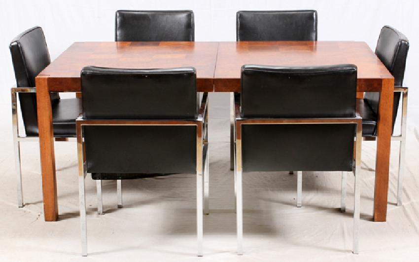 MILO BAUGHMAN FOR FOUNDER'S FURNITURE, BURLWOOD, PARSON'S TABLE, LEAVES AND CHAIRS, 9 PCS. :Milo Baughman for Founder's Furniture, burlwood table, 29" H. x 66" L. x 39" D. Two leaves each 22" W. Total length with leaves 110". Includes six after Milo Baughman Chrome and Naugahyde chairs.